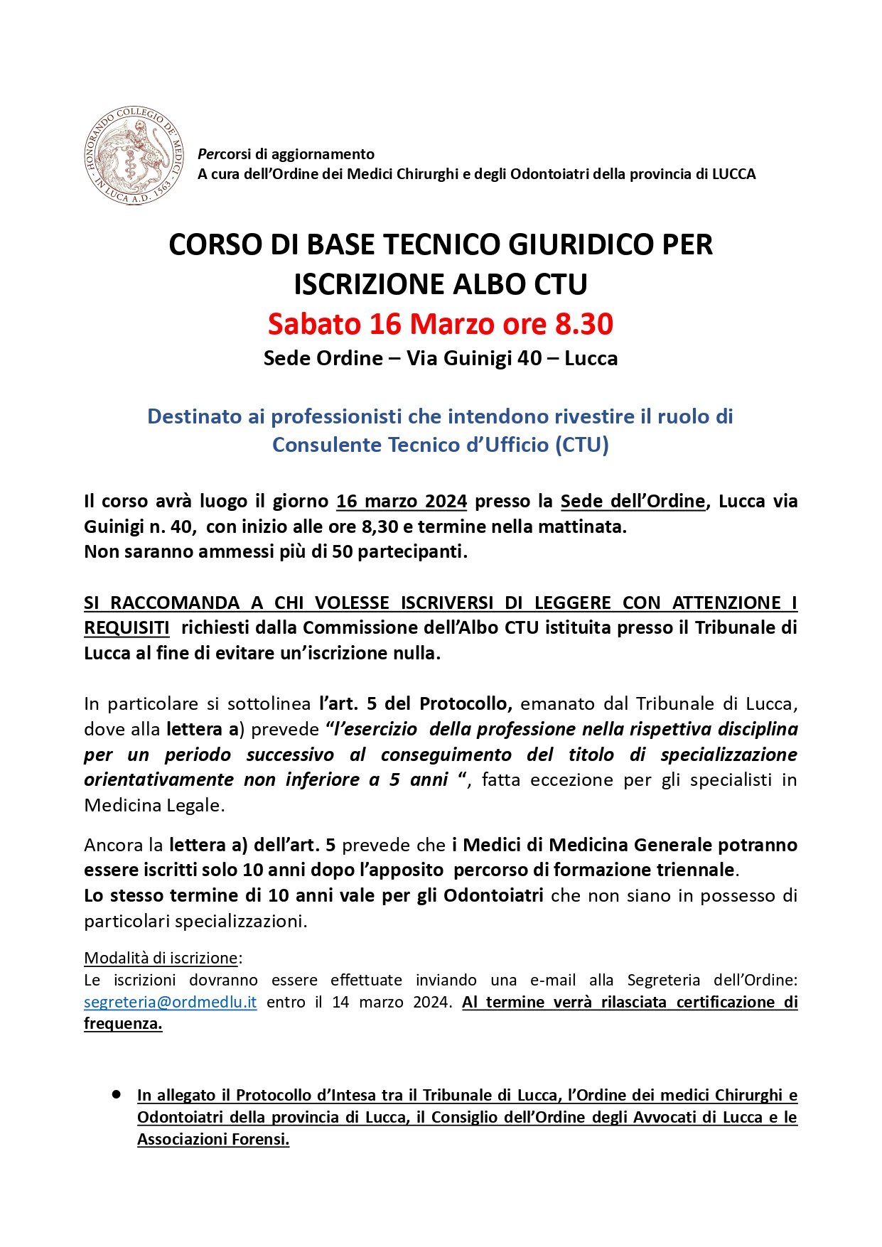 Facendo seguito alle disposizioni di legge emanate dal Ministero di Giustizia e di quanto prescritto dal Protocollo Tribunale di Lucca / Albi Professionali in merito alla iscrizione all’Albo dei CTU, tenuto conto che è prevista a pena di esclusione la frequenza ad un corso di base sugli aspetti informatici e giuridici propri dell’attività di CTU, considerato che anche agenzie private stanno proponendo questo tipo di corso, l’Ordine Medici Lucca ha organizzato una analoga iniziativa (vedi sopra).